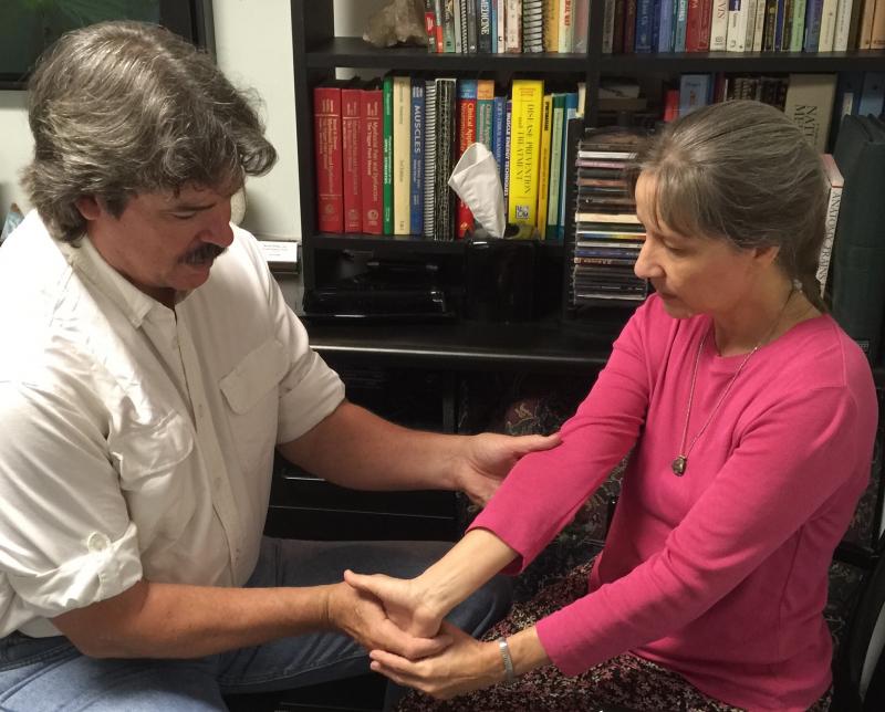 Showing a client how to stretch out the flexors of the forearm which are often a problem in carpal tunnel syndrome.